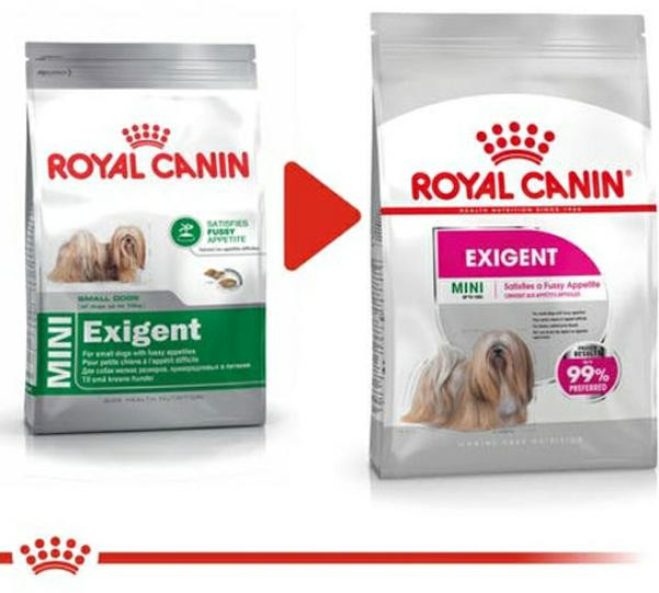 غذای خشک رویال کنین سگ نژاد کوچیک بدغذا اگزیجنت،قطعات غذایی شامل دو نوع بافت متفاوت است(چیپسی و نرم)،که اشتهای سگ های ایرادگیر را تحریک می کند. royal canin mini exigent،حاوی مواد وطعم دهندهای منحصر به فردیست که از پوست و پوششدمراقبت می کنند. این غذای سگ رویال،به دلیل داشتن مواد کلاته کننده کلسیمی از تشکیل تارتار پپیشگیری می کند.